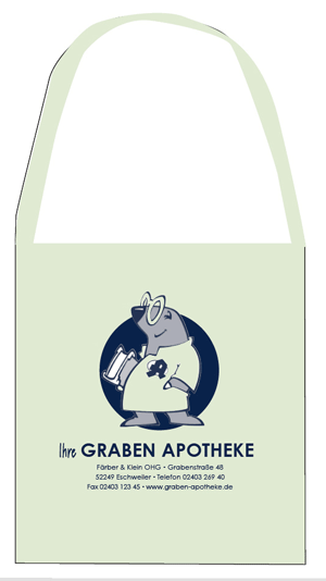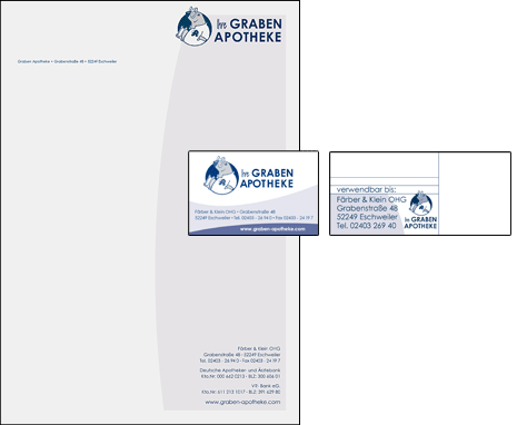 Logo-Entwicklung mit kompletter Geschäftsaustattung und Webauftritt für eine Apotheke. Plus Entwicklung einer Figur als Sympathieträger.